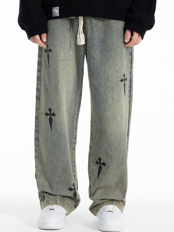 Pantalones de pierna recta con cordón y estampado cruzado desgastado para hombre