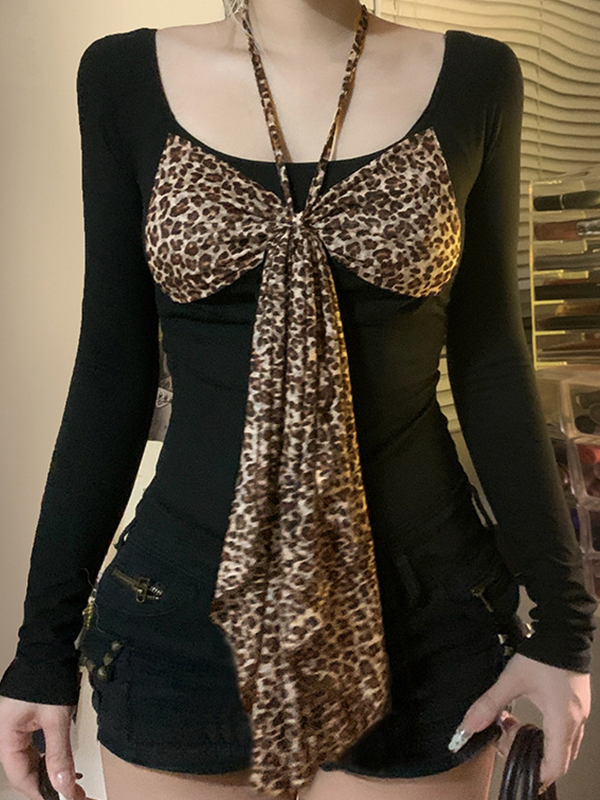 Camiseta de manga larga con cuello halter, lazo y estampado de leopardo