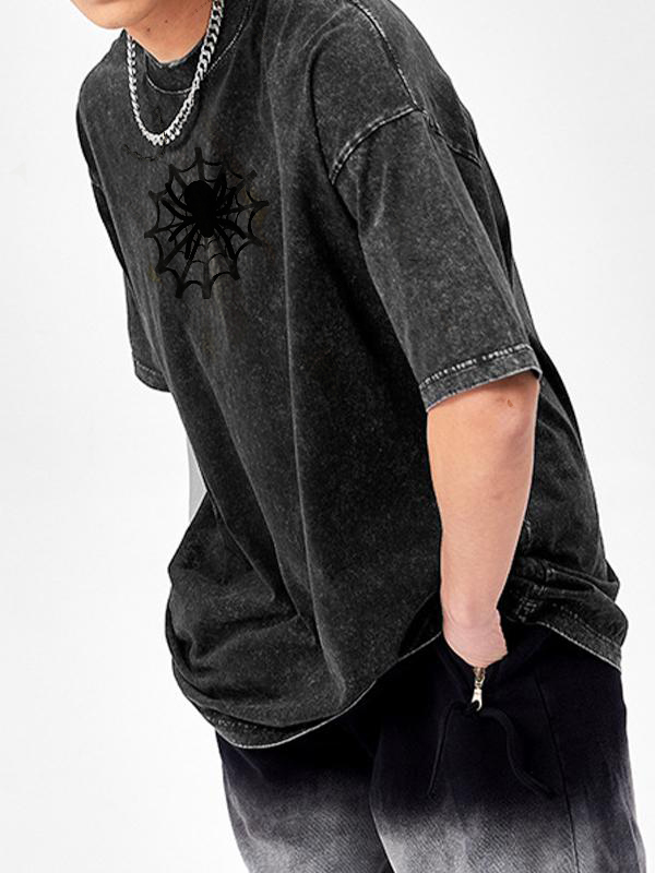Camiseta de manga corta extragrande lavada con estampado de arañas para hombre