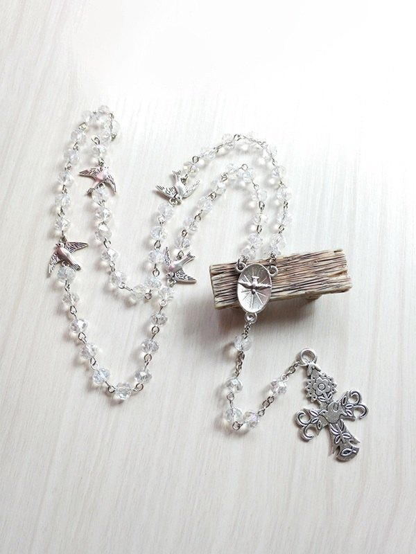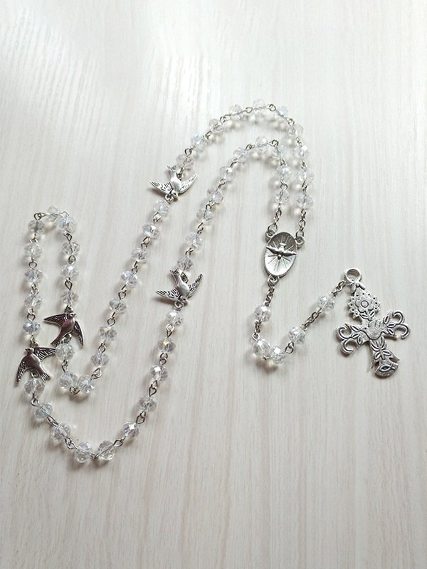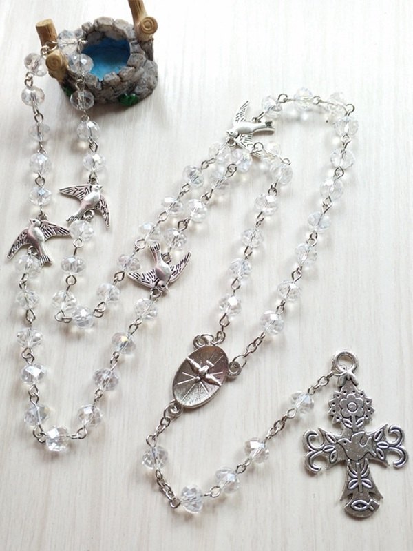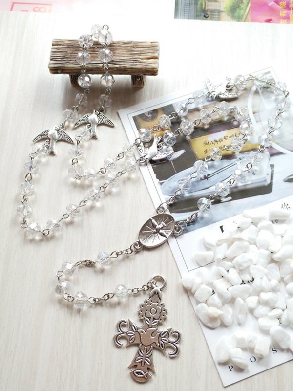 Collar de cuentas largas con colgante de cruz de paloma