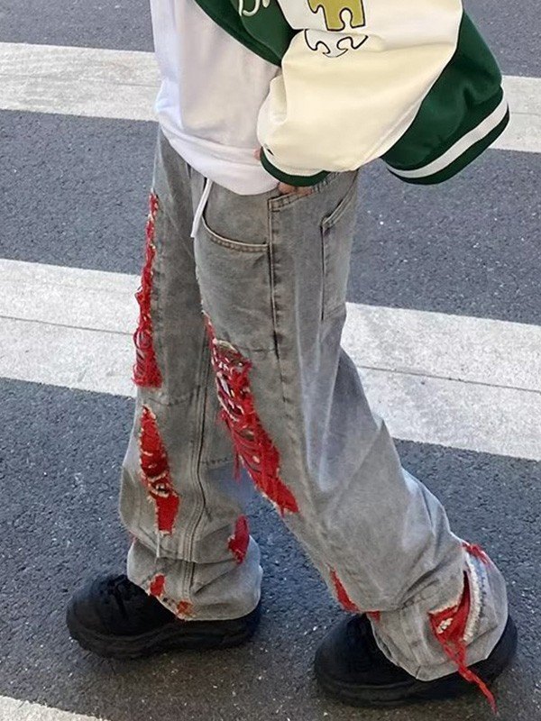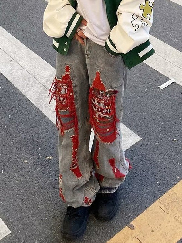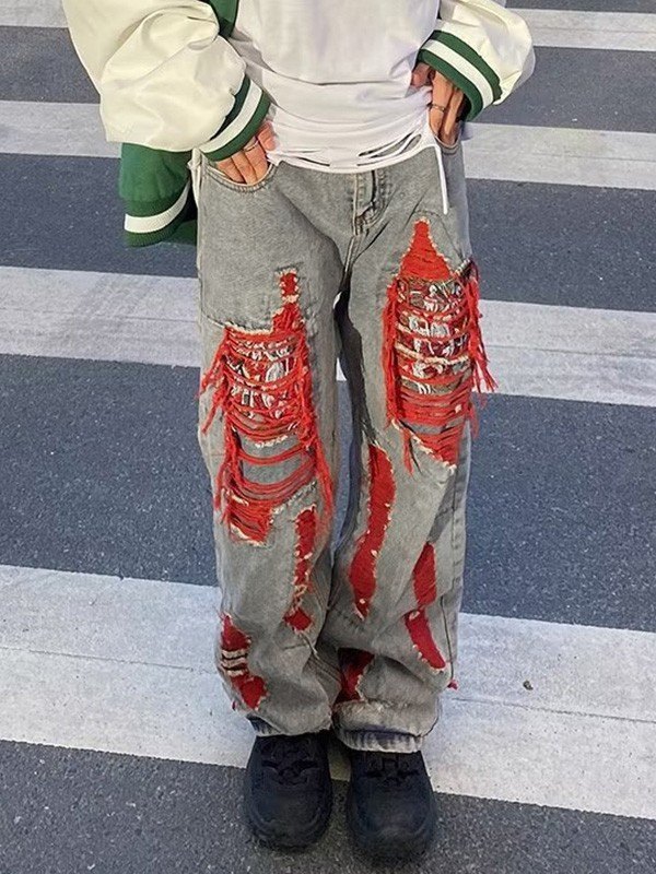 Diseño: Estos jeans desgastados de inspiración vintage con forma de pernera ancha corte, presenta detalles de rasgaduras deshilachadas en contraste y diseño de bolsillos funcionales, terminado con un botón de cremallera en la parte delantera.