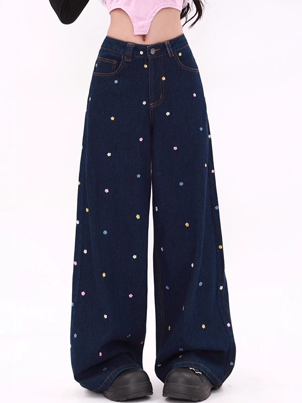 Vaqueros boyfriend retro con bordado floral en azul oscuro