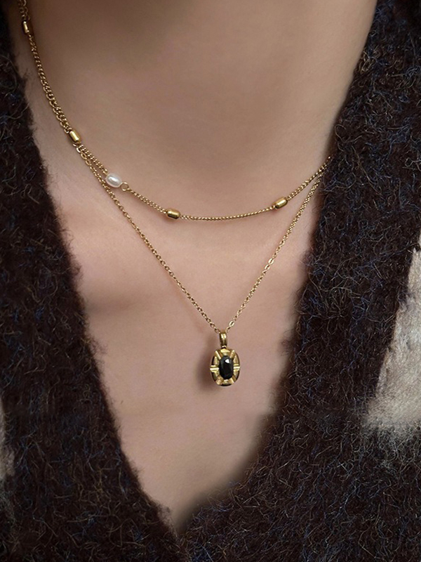 Collar con diseño apilado de perlas y colgante de circón negro
