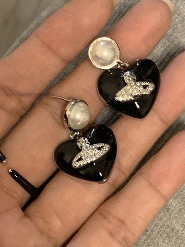 Pendiente de botón con diamantes grabados de Saturno en forma de corazón negro