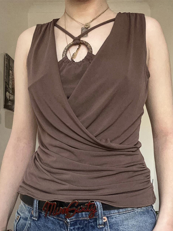 Camiseta sin mangas de dos piezas con escote cruzado y cuello redondo falso